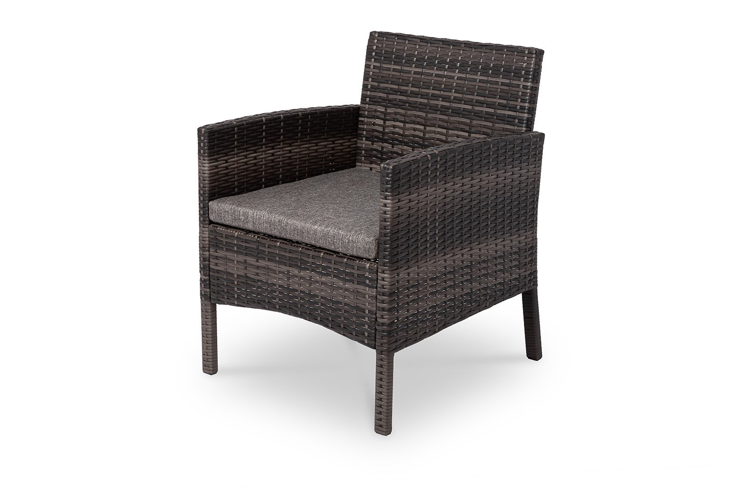 Вся мебель состоит из элементов, идеально предназначенных для использования на улице. Так, металлический каркас, оплетенный искусственным ротангом, не будет портиться от воды, мебель не потрескается и не потеряет свой цвет на солнце. Цвет отделки – серо-коричневый цвет.