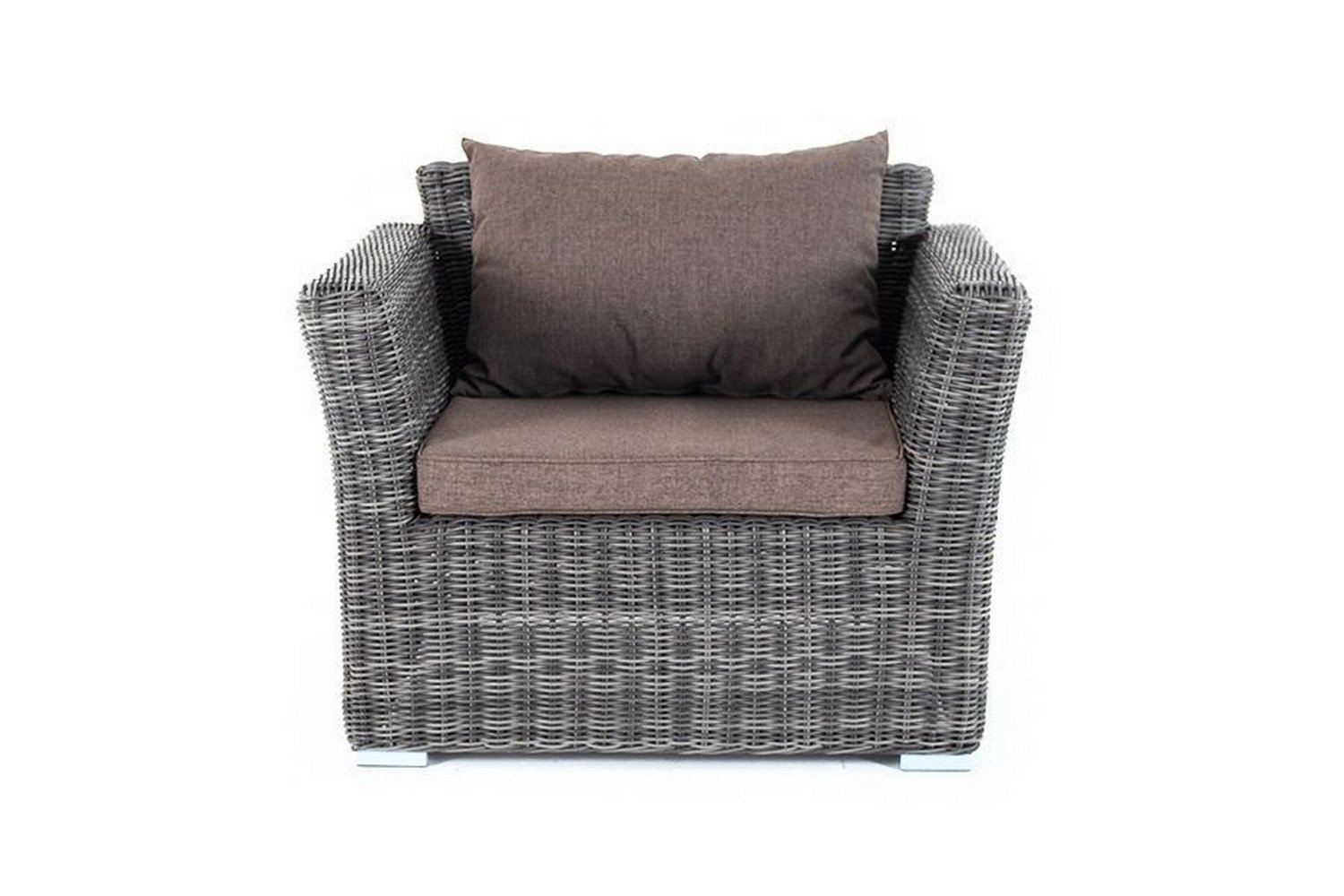 Кресло 4SiS Капучино серого цвета одна из таких моделей садовой мебели. Форма кресла квадратная, у него широкие подлокотники и небольшая спинка, а размеры 104х81,5х86,5 см. максимальная нагрузка на одно такое кресло – 150 кг, при его сравнительно небольшом весе в 21 кг. Добиться прочности и легкости конструкции позволяют материалы, из которых состоит кресло. Каркас состоит из алюминия, который покрыт искусственным ротангом, материалом, имитирующий переплетение настоящего дерева, но гораздо прочнее и долговечнее.